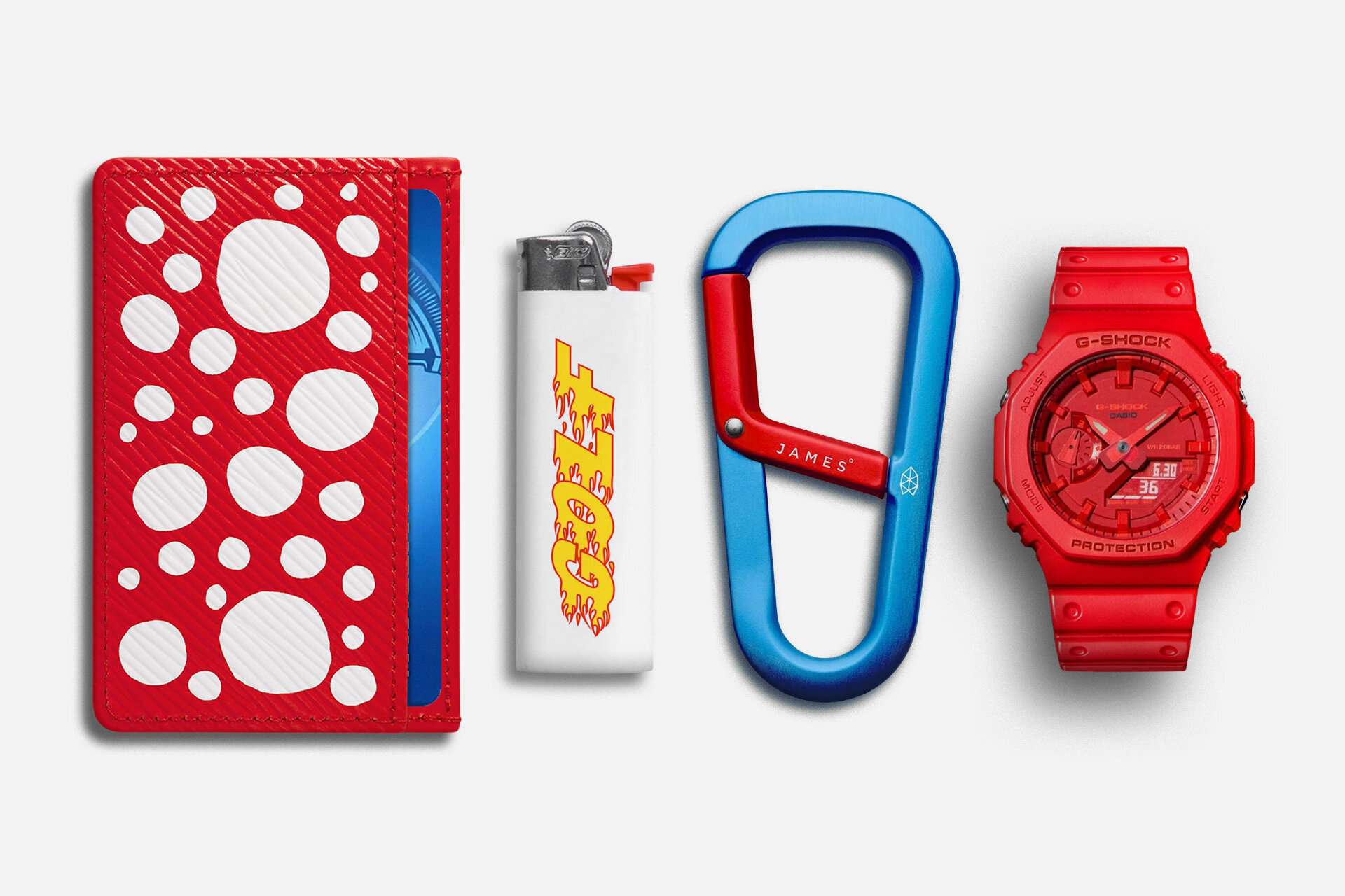 A childlike sense of wonder is palpable in this bold set of wallet, lighter, carabiner, and watch.