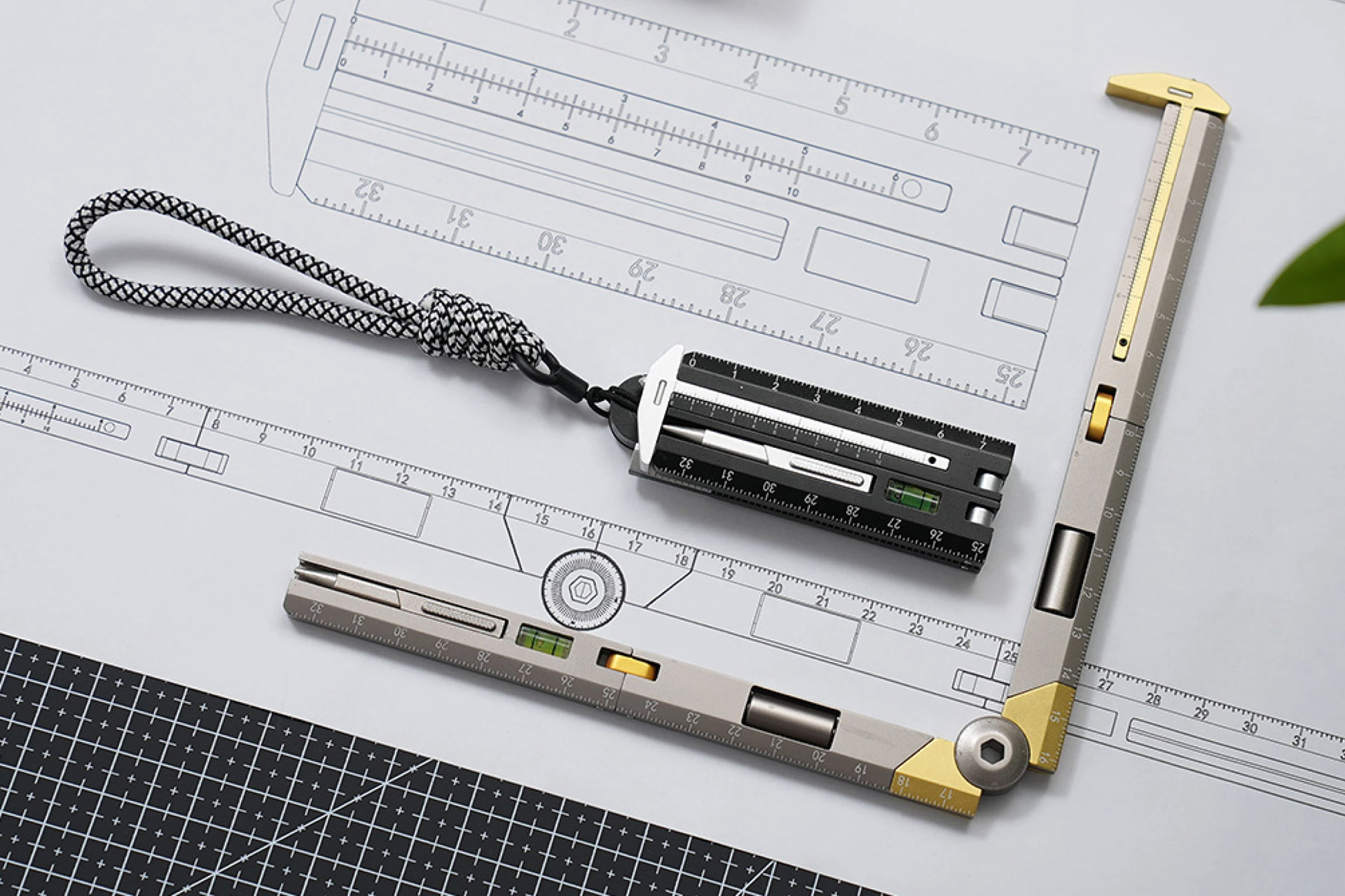 Not all multi-tools are meant for around-the-house tasks. The OMNI-R Multi-tool Ruler is made for engineers, architects, designers, and anyone else that needs precision on a small scale. Expanding from 3.2 to 12.75 inches, it serves as a straight edge, a ruler, a protractor, a vernier caliper, a bubble level, a leveling aid, and thanks to an "extended flying pen" system, a graphite pencil, #10 extended blade, and compass. It's crafted from either black anodized aluminum or titanium and brass, has 0.1mm and 1/64" precision laser etched scales, and tritium tubes to help locate it in the dark.