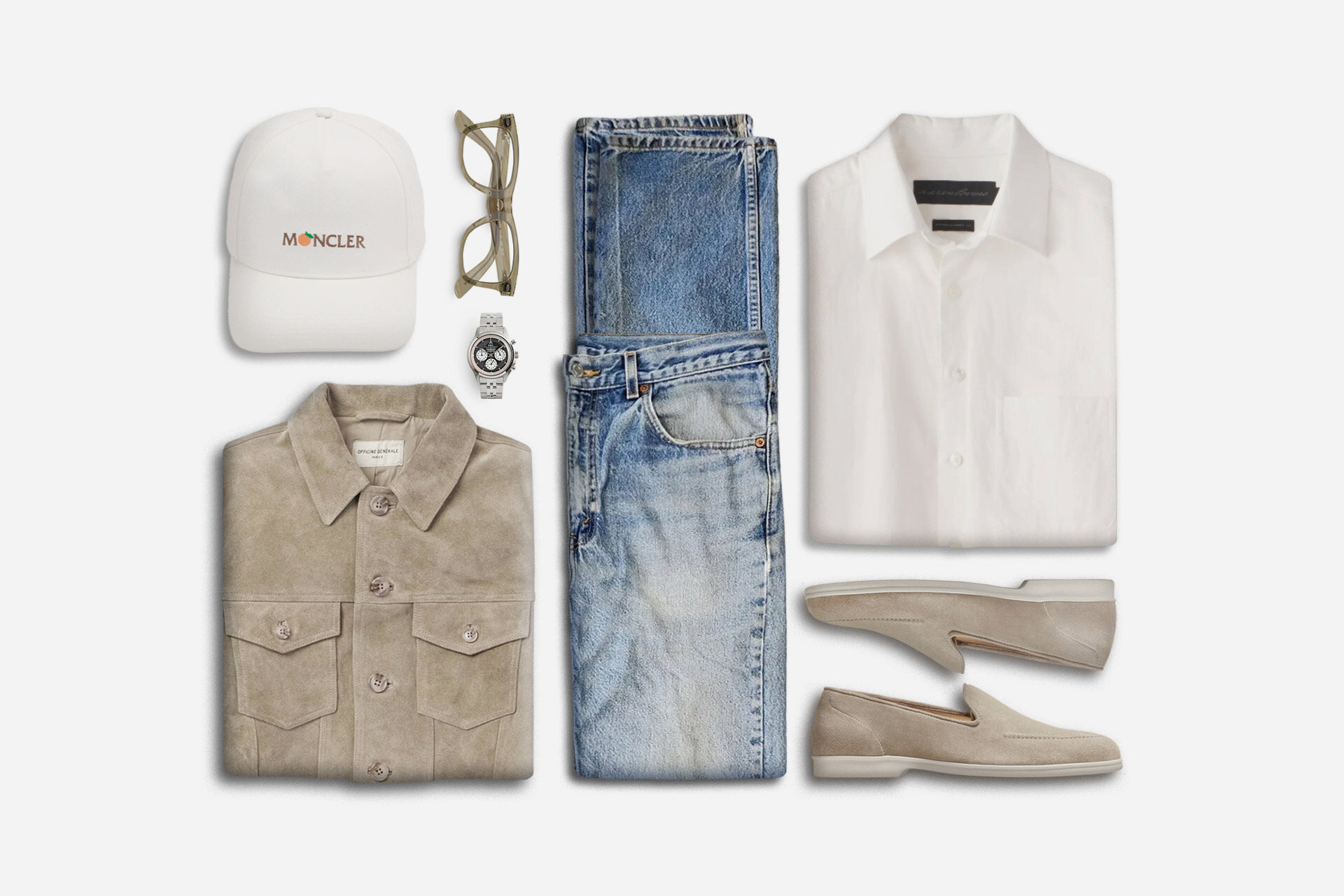 A worn aesthetic gives this white, denim, and tan ensemble an effortlessly cool vibe.
