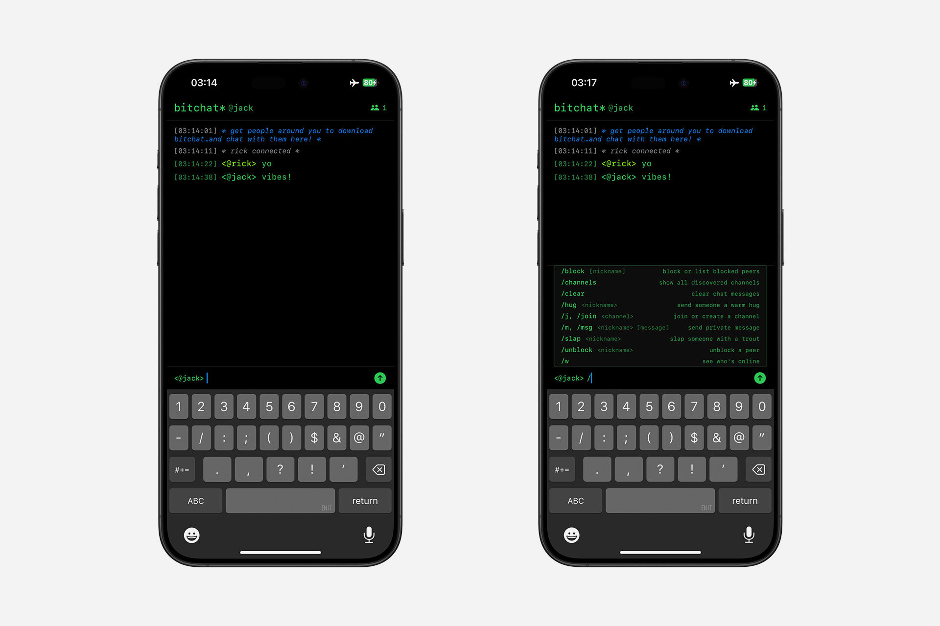Twitter co-founder Jack Dorsey has a new side project. Dubbed Bitchat, it's a secure mesh chat program that works over Bluetooth, and thus doesn't require an Internet connection. In a similar fashion to old-school chat service IRC, rooms can be created using hashtags for specific topics, and password-protected if desired; like Twitter, users are given @nicknames. All messages are end-to-end encrypted, and can relay through peers for a range of over 300 meters. An early build was released via Apple's development tool Testflight, but has hit its user limit — but intrepid users can download the source code from GitHub and build the app themselves.