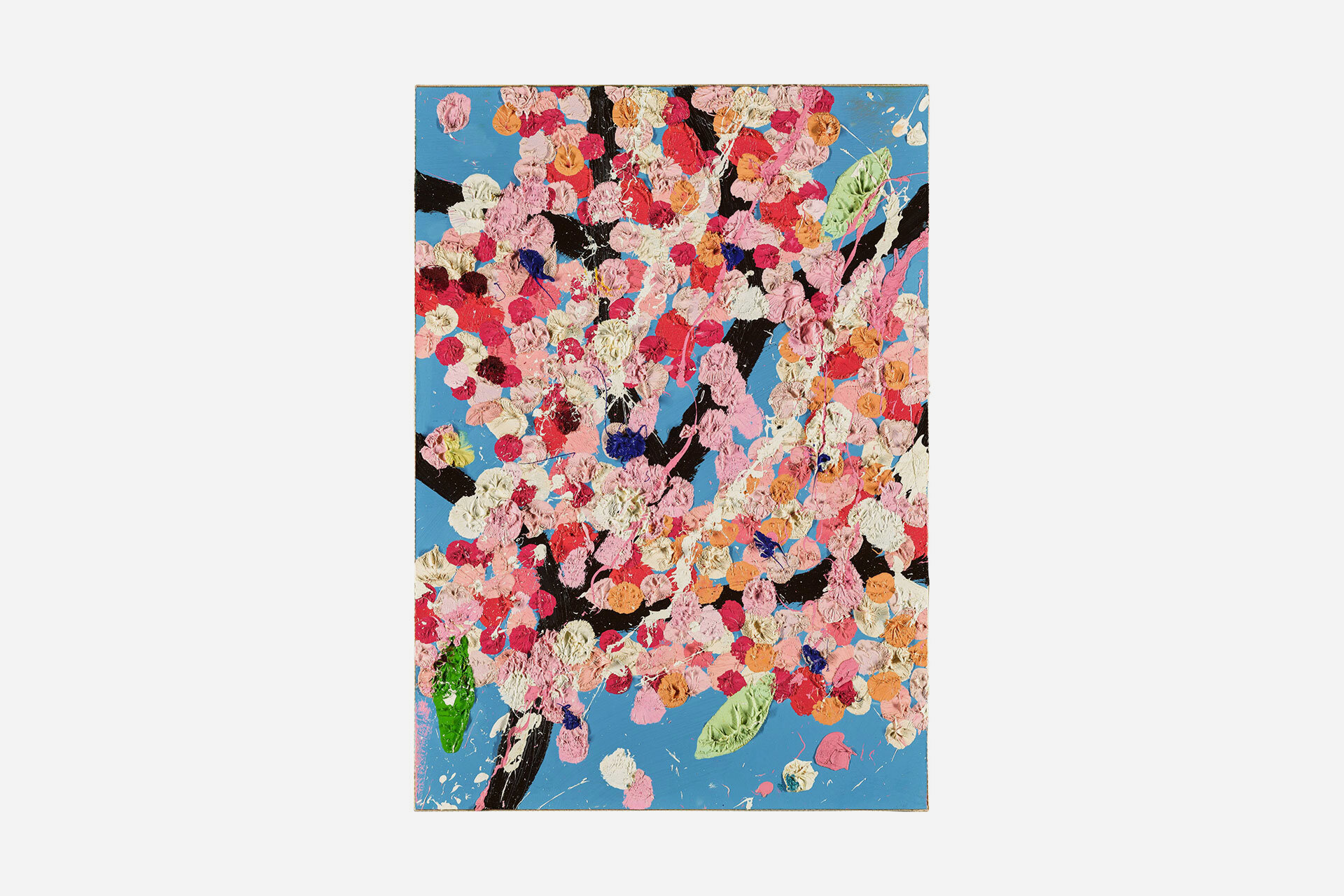 Along with dead animals preserved in formaldehyde, British artist Damien Hirst is known for his "spot paintings". 2021's Tempting Blossom is an example of the latter. Atop a periwinkle blue background and black lines representing branches are spots in various shades of white, red, pink, and green, with the resulting whole resembling a blooming plant. Rendered in oil on card, it measures 23.5" x 16.5" and is signed, titled, and dated on the reverse.