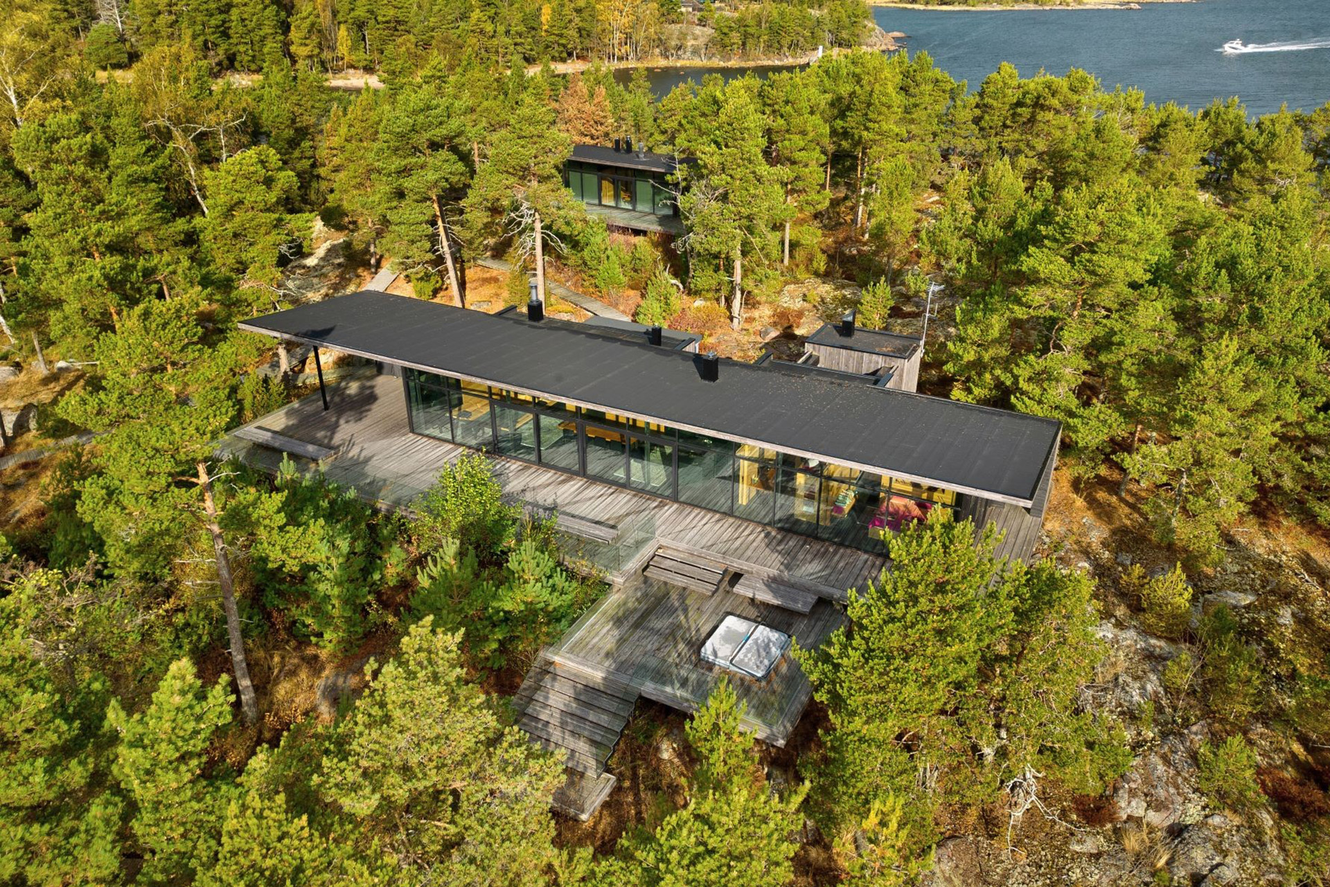 Located just five minutes from the mainland in Porkkala, Finland, Remmarholmen Island is a private, modern off-grid retreat. The five-acre island is home to a main house, a guesthouse, and a sauna, designed by architect Joanna Maury and crafted from granite, glass, oak, pine, and rusted Corten steel, with three total bedrooms, three baths, and a sunken conversation pit. Wooden paths made of durable Siberian larch connect the structures and the large terraces, while geothermal energy, a desalination system to obtain drinking water from seawater, and a wastewater system help keep things habitable while reducing the island's ecological footprint.