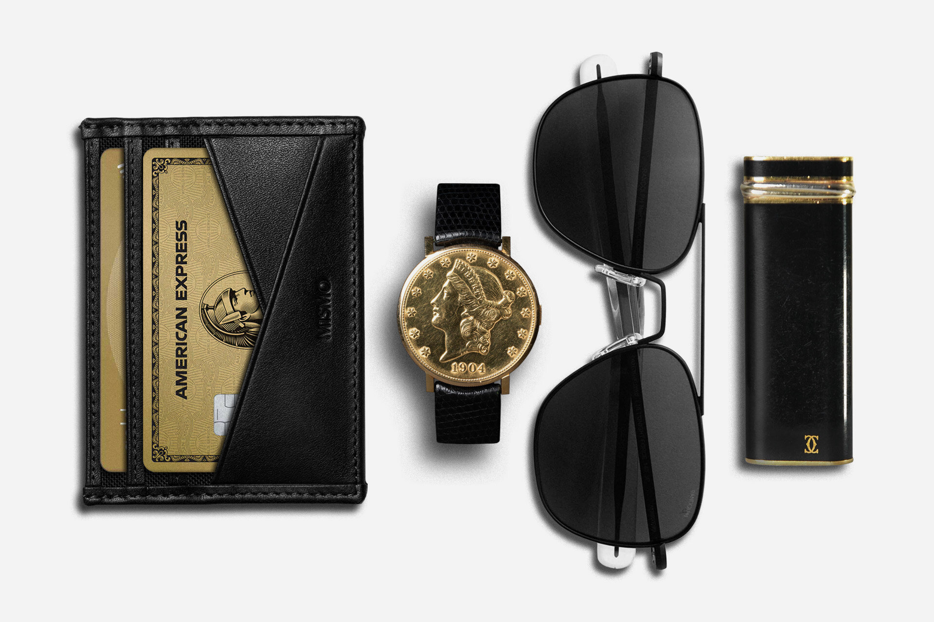 A vintage gold coin watch sets the tone for this carry of aviators, wallet, and lighter.