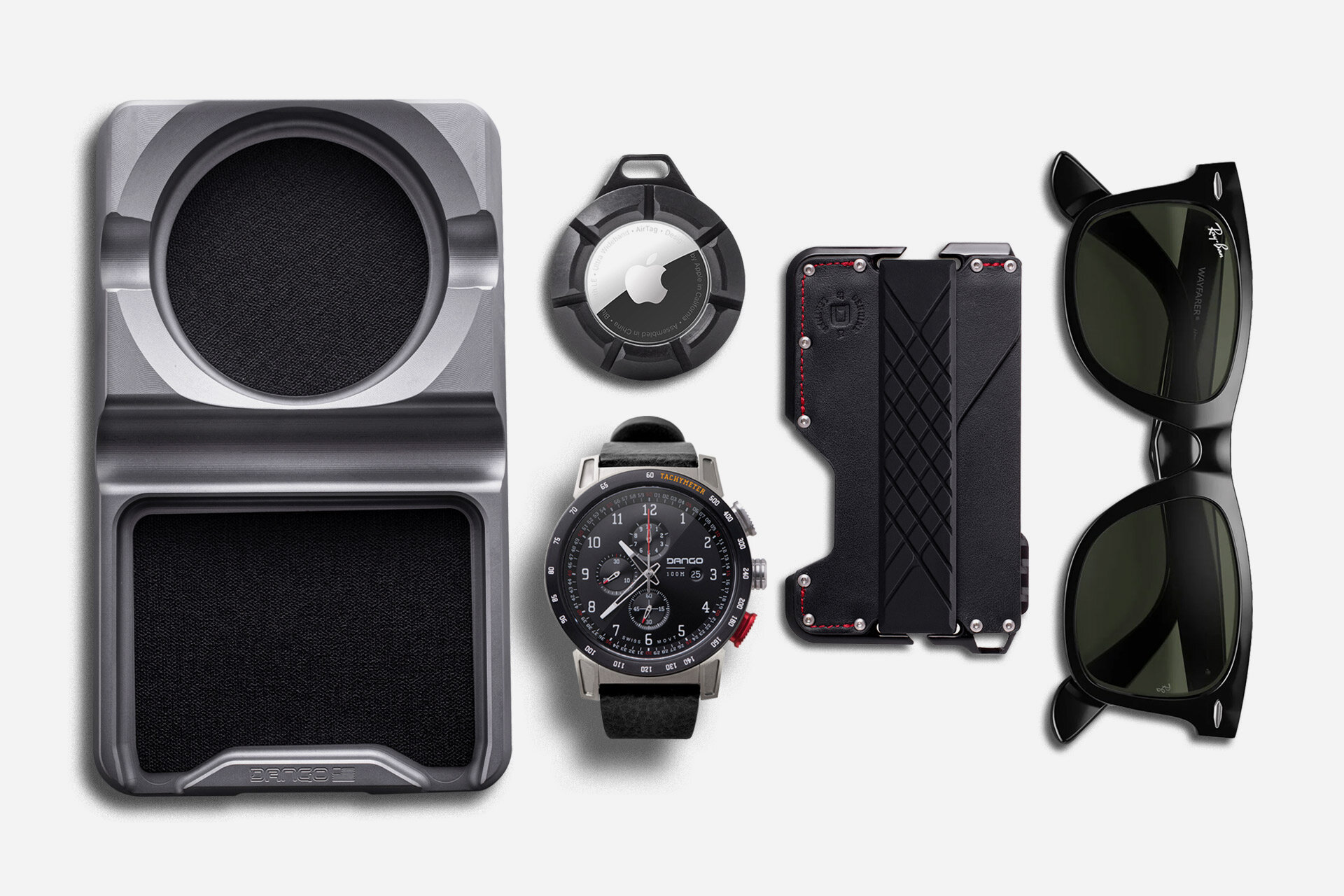 Keep your goods sorted and safe with this mix of tray, AirTag capsule, watch, wallet, and shades.