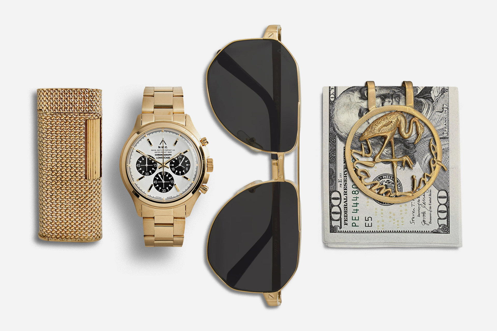 A vintage solid gold money clip leads this gilded combination of lighter, watch, and sunglasses.