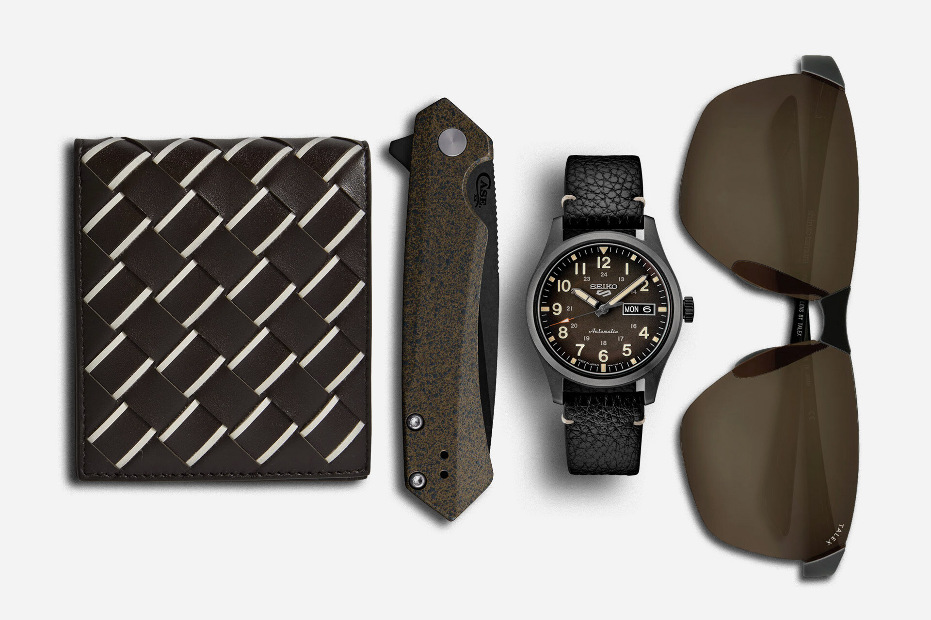 A deep umber color provides contrast to the blacks of this wallet, knife, watch, and sunglasses.