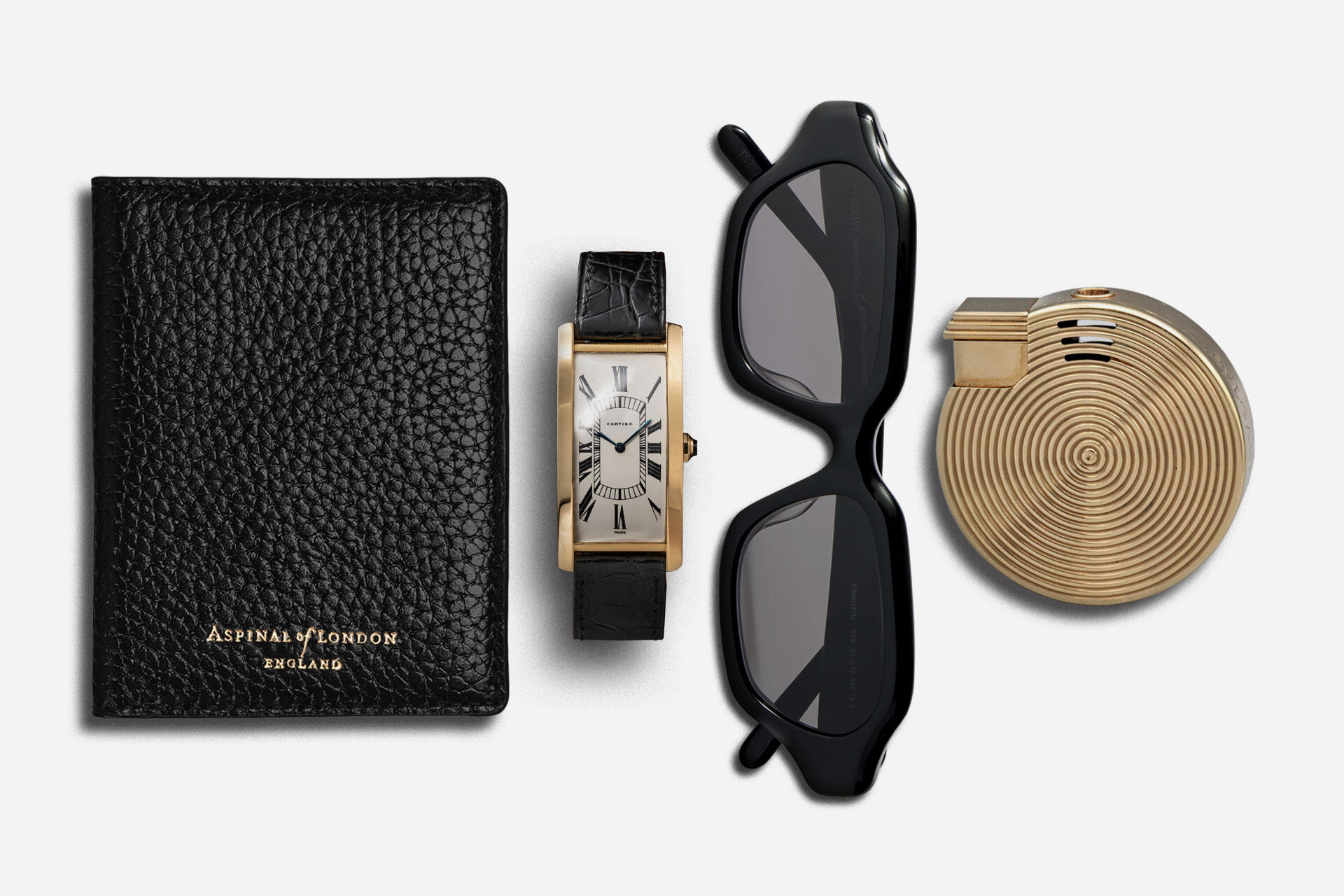 A vintage Cartier Tank watch grounds this grouping of wallet, sunglasses, and vintage lighter.