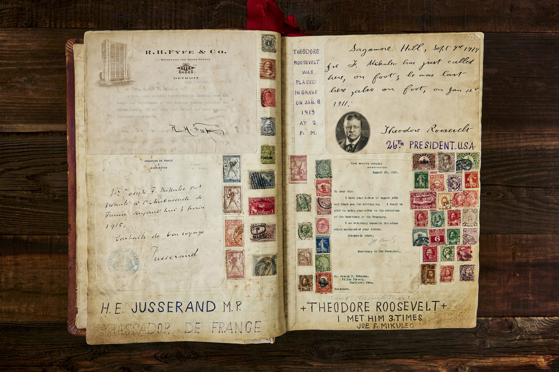 Croatian-born Josef Mikulec left home to travel the world before his 20th birthday in 1898. At some point in Italy, he saw a man carrying an autograph book to document his journeys. Beginning in 1911, Mikulec — dubbed The World Traveler by The New York Times — began gathering autographs and mementos himself, using them to fill in the pages of book after book, which have since been bound together to create an enormous 11" x 16" x 10" tome. It contains mementos from at least 33 countries in at least 23 languages and carries signatures and writings from a slew of dignitaries, including those of six U.S. presidents, two monarchs and a prime minister of Great Britain, the president of China, leaders of Japan, Australia, India, and Singapore, prime ministers of Canada, Thomas Edison, and Andrew Carnegie, it's a fascinating piece of history and is now being offered for sale by the Raab Collection.
