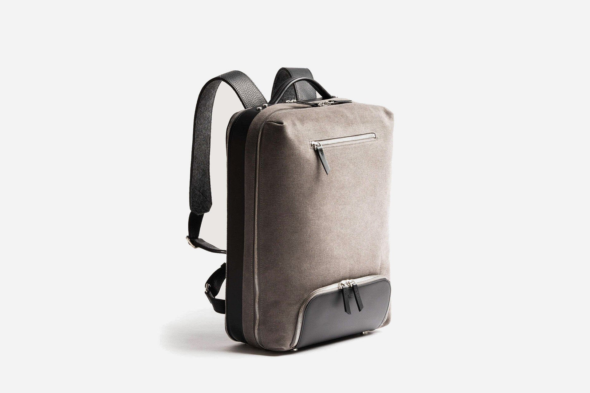 The Antoine 36-Hour Backpack from Lundi fuses tailored aesthetics with tactical utility — built for everything from boardroom pitches to late-night hotel check-ins. Crafted from rugged grey canvas and black leather, it moves with the quiet confidence of a bespoke suit and the function of a refined carry-on. A dual-compartment layout keeps work and wardrobe in sync: one side fits up to a 16-inch laptop, tablet, and quick-access tools like cards and cables, while the other secures your overnight kit—whether that's gym gear or a pressed suit. Don't just show up — arrive ready.